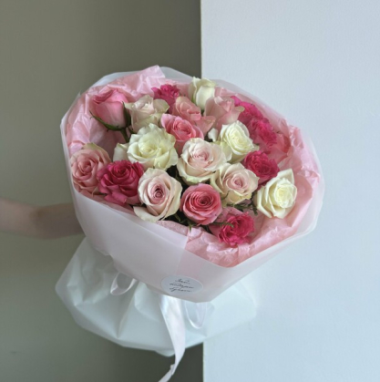 Состав: 21 кенийская роза (красные, розовые, белые), декоративная зелень, упаковка.