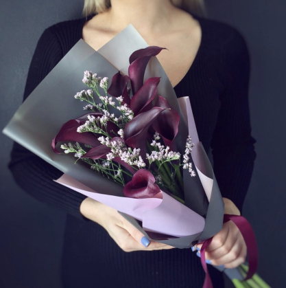 Букет из 9 фиолетовых калл с лимониумом | Купить в Егорьевске