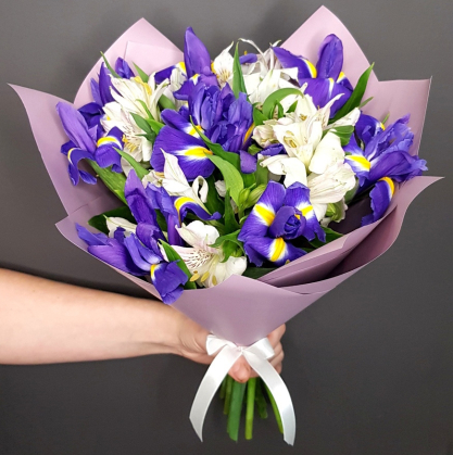 Букет сочетает в себе яркие синие ирисы и нежные альстромерии, создавая гармоничное и стильное оформление. Ирисы с их элегантными лепестками придают композиции глубину и выразительность, в то время как альстромерии, с их разнообразием оттенков и текстур, добавляют легкости и воздушности. Такой букет станет не только прекрасным украшением интерьера, но и замечательным подарком для любого повода. Наши цветы всегда свежие, способны поднять настроение и создать атмосферу уюта и радости.