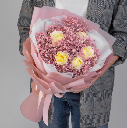 Букет "Нежные объятия" с крашенной гипсофилой и розой в Егорьевске