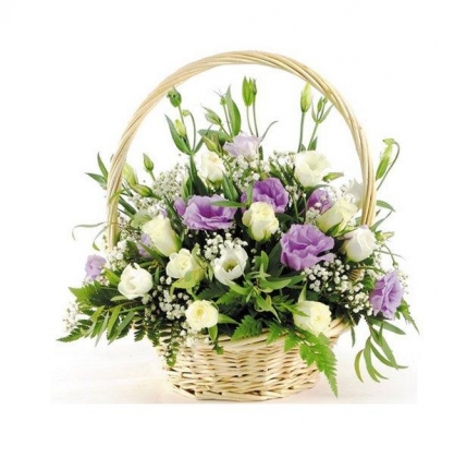 Корзина из разноцветных эустом с добавлением гипсофилы и папоротника