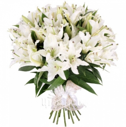 Очень большой букет, составленный из веточек белой лилии в натуральной упаковке